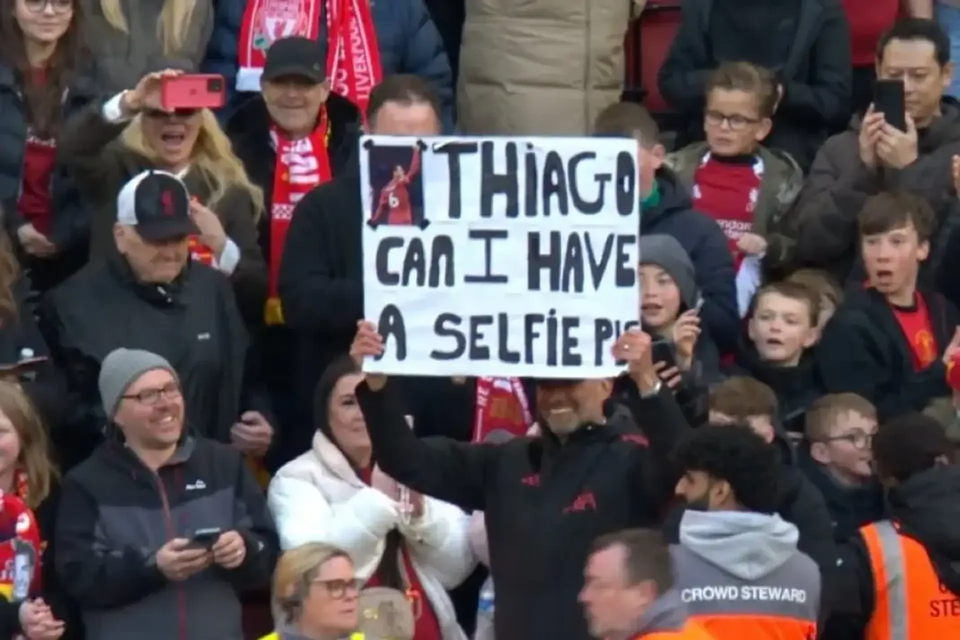 Главным моментом дня стал эпизод на боковой линии. Клопп был замечен с самодельным плакатом, на котором красовалась надпись: «Тьяго, можно селфи, пожалуйста?». Табличку с вырезанным изображением испанского маэстро Юрген, вероятно, одолжил у юного болельщика, позируя перед камерами со своей фирменной широкой улыбкой.