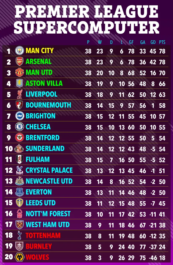 В итоге обе команды финишируют с 78 очками, и судьбу золотых медалей решит разница мячей. Суперкомпьютер предсказывает, что обе стороны закончат сезон с 78 забитыми голами.
